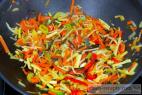 - Na panvicu nalejeme lyžicu oleja a zmes zeleniny orestujeme pri teplote 120°C. Ak používame mrazenú, dopredu ju nerozmrazujeme. Trochu ju osolíme a restujeme maximálne 6 až 8 minút, aby zostala chrumkavá. Po tejto dobe vypneme a presunieme zmes zeleniny treba do misky. Je dobré, keď nám zelenina nevychladne, preto ju prikryjeme.