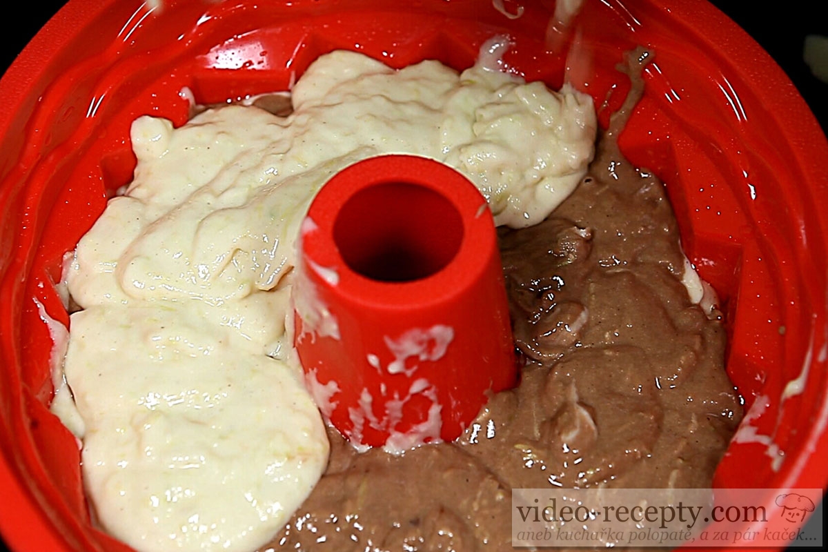 8. Do formy nalejeme polovicu svetlého cesta, potom cesto s kakaom a nakoniec zvyšok svetlého cesta.