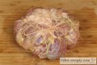 - Kapsu uzavrieme a dočasne zaistíme špáradlami. Potom ju previažeme niťou, ktorú postupne uťahujeme.