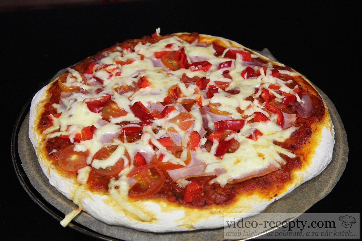 - Placku natrieme paradajkovým základom, ozdobíme kúskami šunky, paradajkami cherry nakrájanými na plátky, paprikou nakrájanou na kúsky a strúhaným syrom.