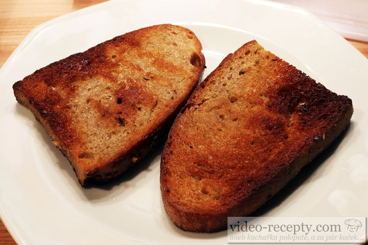 - Osmažte na oleji alebo masti chlieb z jednej strany a hrianku vyberte z panvice. Namažte na opraženou stranu nátierku a posypte strúhaným syrom. Potom ju vložte na panvicu a nechajte pár minút zapiecť.