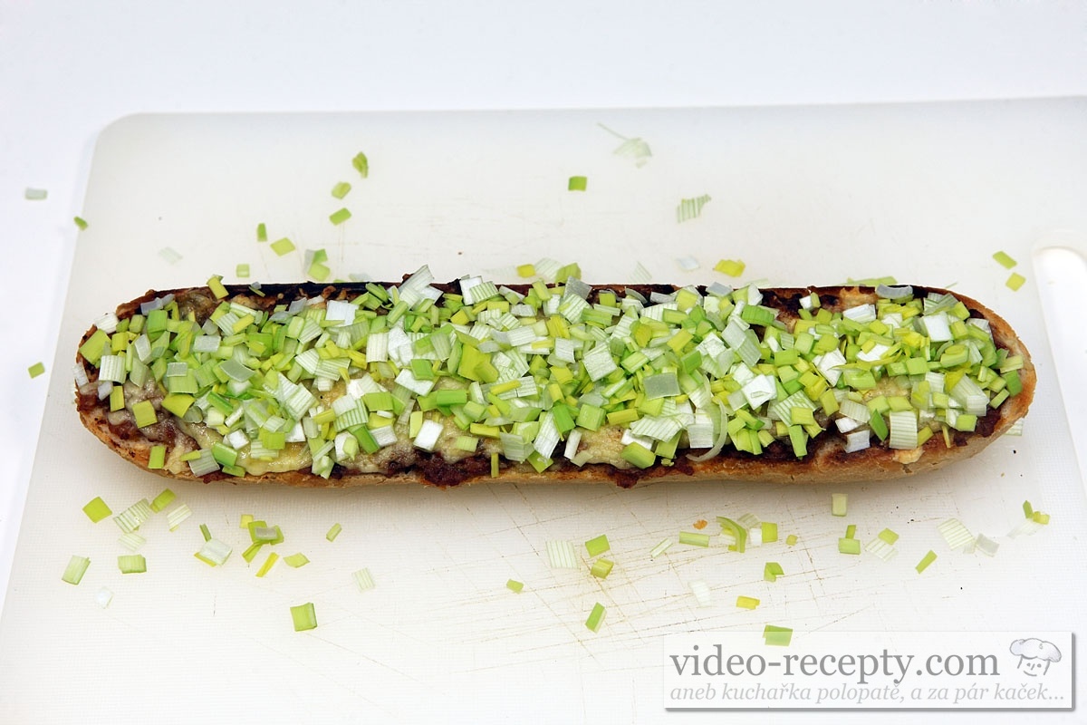 - Dopečenú bagetu vyberieme z rúry a zasypeme dostatočným množstvom nadrobno nakrájaného póru.
