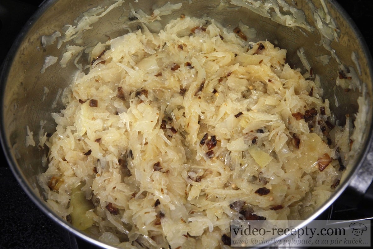 - Nálev z kyslej kapusty zlejeme do nádoby. Kapustu vsypeme do vhodného kastróla, pridáme asi 200 ml vody, 1/2 lyžičky drvenej rasce, lyžičku cukru, premiešame a dusíme kapustu do mäkka. Pritom kontrolujeme dostatok vody.