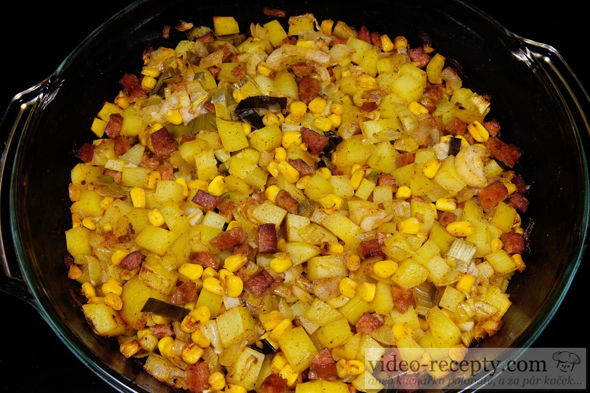 - Olúpané zemiaky nakrájajte na kolieska alebo kocky, vložte do zapekacej misky a pridajte cibuľu, údeninu a korenie podľa zoznamu alebo videa. Dobre premiešajte a posypte drveným kmínom.