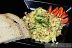 - Prilejeme vajcia, trochu osolíme, prípadne posypeme trochu korením a miešame kým vajcia nestuhnú.
