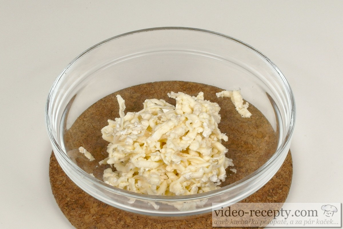 - Hermelínovú nátierku s chrenom a jablkami zahájime nastrúhaním dobre vychladeného hermelínu. K nemu pristrúhame 2 stredne veľké jablká bez šupky.