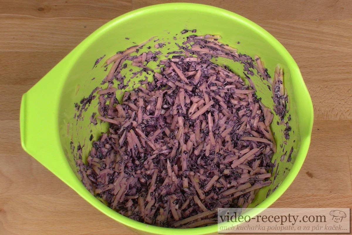 - Kapustový šalát s jablkami zahájime nastrúhaním kapustu na drobné kúsky. Olúpaná jablká nastrúhame na drobnejšie kúsky, váhovo by ich malo byť rovnako ako červenej kapusty.