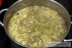 6. Potom pridáme čerstvý alebo sterilizovaný kôpor. Ak použijeme čerstvý, stačí nám tak 4 až 5 lyžíc podľa chuti. Ak použijeme sterilizovaný, potom obsah pohára zcedíme a do polievky dáme len hmotu, ktorá nám zostala na sitku.