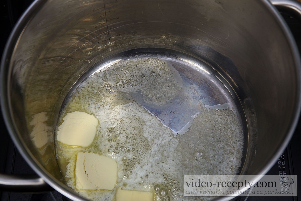 1. Kôprovou polievku sa sázeným vajcom zahájime rozpustením masla v päťlitrovom hrnci. Na ňom orestujeme veľkú cibuľu nakrájanú nadrobno.