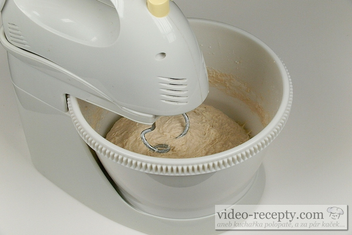 - Do hnetacie misy vsypeme 500 gramov hladkej múky, 1/2 lyžičky soli, 200 ml mlieka, pridáme kvások, 2 lyžice oleja a vymiesime.