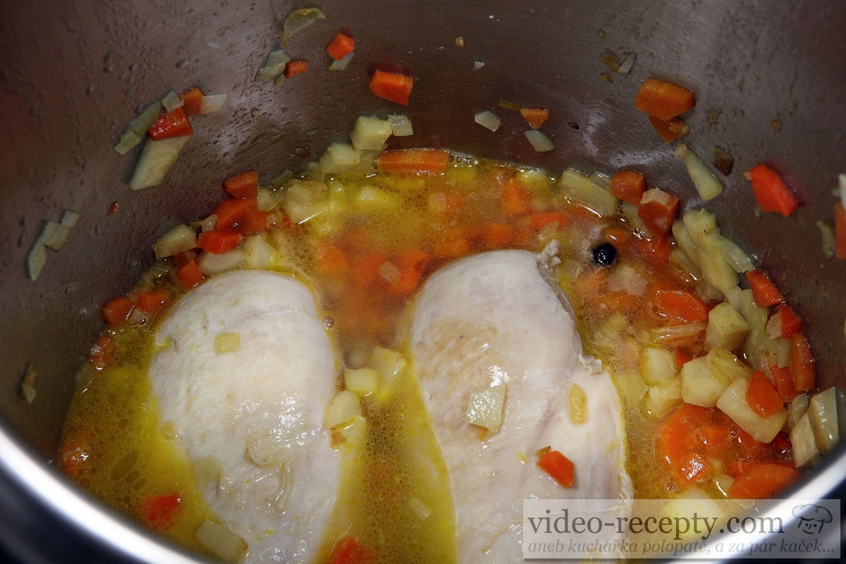 5. Zalejeme vývarom tak, aby všetko bolo takmer potopené. Ak nemáme vývar, zalejeme vodou a pridáme kocku masoxu.