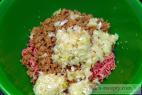 - Do vhodnej misy vložíme mleté mäso, najlepšie 1:1 bravčové - hovädzie a pridáme mleté sójové mäso.