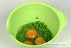 - Omeletu s hráškom zahájime tým, že do misky dáme 150 g čerstvého, alebo rozmrazeného hrášku, 3 vajcia, 1/3 lyžičky soli a rozmiešame tak, aby sa hrášok nezdeformoval.