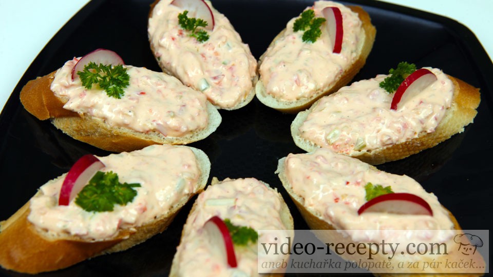 - Do misky dáme 250 gramov mäkkého tvarohu, 2 lyžice kyslej smotany, 2 lyžice majonézy, podľa chuti asi 1/4 lyžičky soli, rovnú lyžičku cukru, 1/8 lyžičky mletého čierneho korenia a dobre zamiešame, alebo použijeme elektrický ručný šľahač.