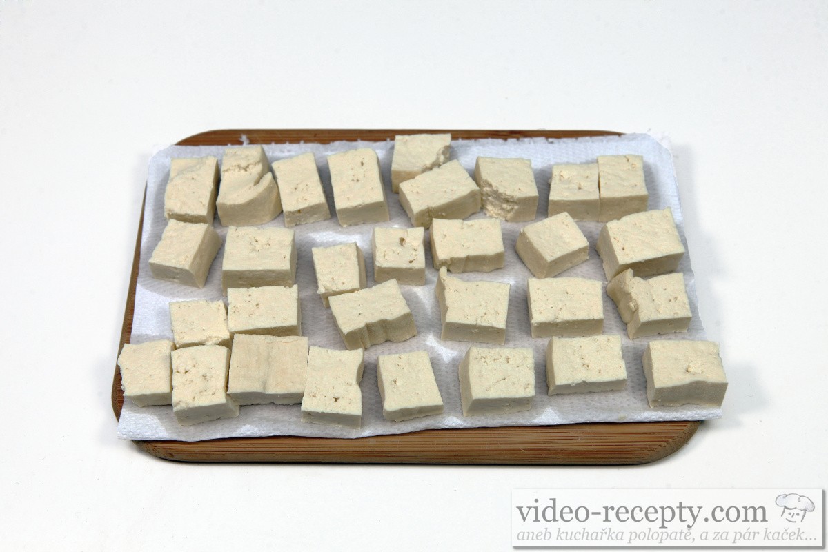 - Paradajkove tofu zahájime nakrájaním tofu na kocky 3 x 3 cm. Keďže sa tofu skladuje vo vode, tak ho teraz dobre osušíme, najlepšie papierovými utierkami, ktoré nepúšťajú chĺpky.