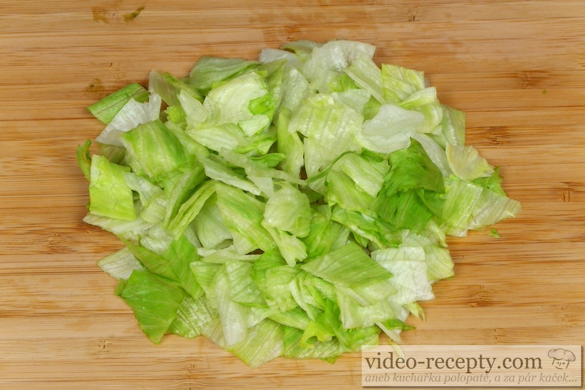 3. Mäso necháme chvíľu odpočinúť, a medzi tým si nakrájame zeleninu. Cibuľu na tenké plátky a paradajky na plátky asi 3 mm hrubé. Ľadový šalát nakrájame na menšie kúsky podľa videa.