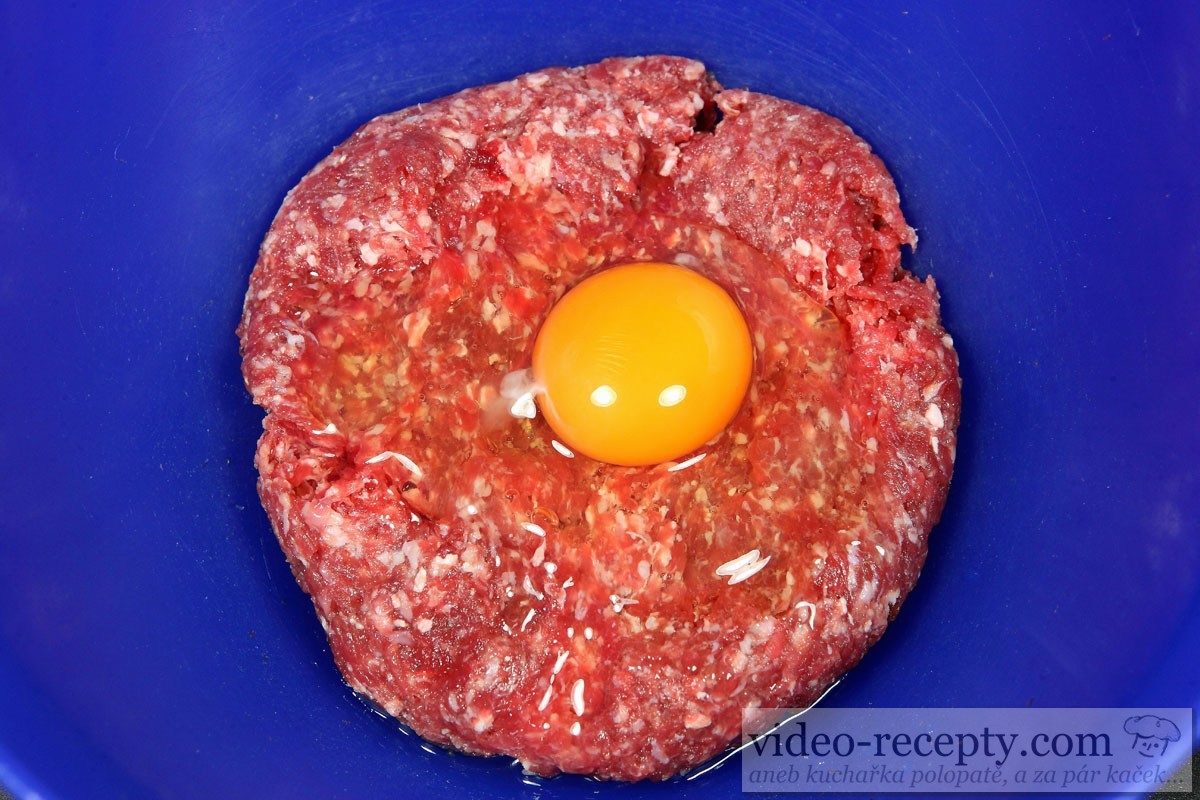 - Mleté mäso dáme do misky, pridáme vajce, soľ, mletú sladkú papriku, mleté čierne korenie, majoránku, sušenú zeleninu, muškátový kvet, strúhanku, prelisovaný cesnak a všetko spolu zmiešame.