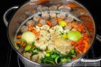 - Prihodíme mrkvu, pór, karfiol a cibuľu nakrájanú na menšie kúsky. Cibuľu môžeme nakrájať, alebo podľa chuti nechať vcelku. Použiť možno tiež treba mrazenú zeleninu, či ju kombinovať s čerstvou. Výber zeleniny je len na vás, použite jej celkovo 350 až 400 g. Mrazenú zeleninu dopredu nerozmrazujeme.