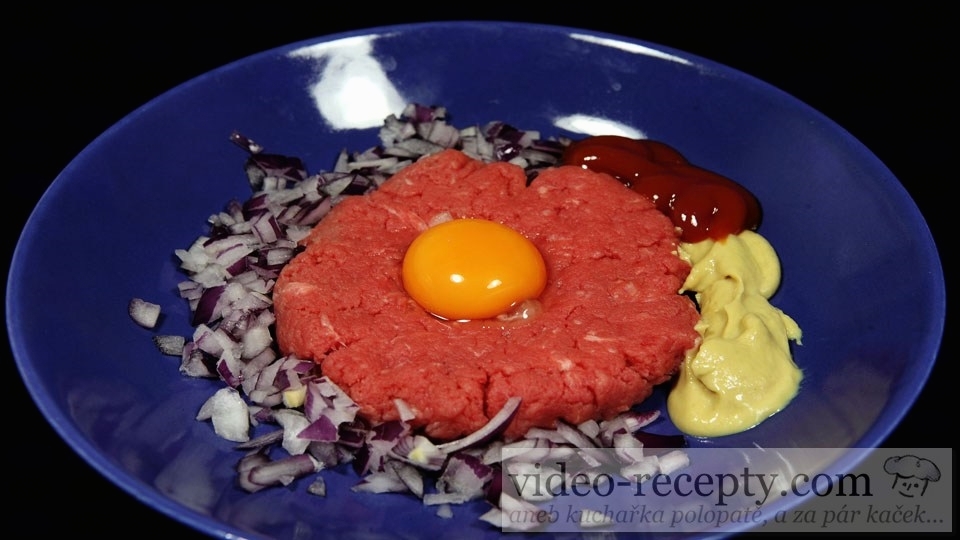 - Mäso preložíme na tanier, navrch položíme žĺtok a okolo mäsa nasypeme nadrobno nakrájanú cibuľku, horčicu a kečup. Každý stravník si primieša do mäsa ingrediencií podľa chuti.