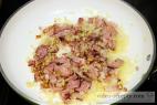 - Na panvicu dáme lyžicu masla a lyžicu olivového extra panenského oleja. Ten pomôže maslu, aby sa pri 120°C nepálilo. Túto teplotu udržiavame po celú dobu. Pridáme nadrobno nakrájanú cibuľu a speníme ju. Po minúte pridáme slaninu nakrájanú na tenšie plátky a nasekané orechy.