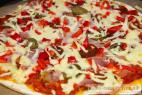 - Placku natrieme paradajkovým základom, ozdobíme kúskami šunky, tenkými plátkami klobásy, plátky feferóniek, paprikou nakrájanou na kúsky a strúhaným syrom.