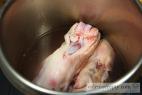 - Do tlakového hrnca vložíme nožičky, koleno a zalejeme dvoma litrami vody. Pridáme asi 100 gramov čerstvej alebo mrazenej koreňovej zeleniny - mrkva, zeler, petržlen, kvôli zlepšeniu chuti vývaru. Ďalej 10 guličiek čierneho korenia, 2 kusy bobkového listu, 5 guličiek nového korenia, lyžičku soli a 1 menšiu cibuľu.