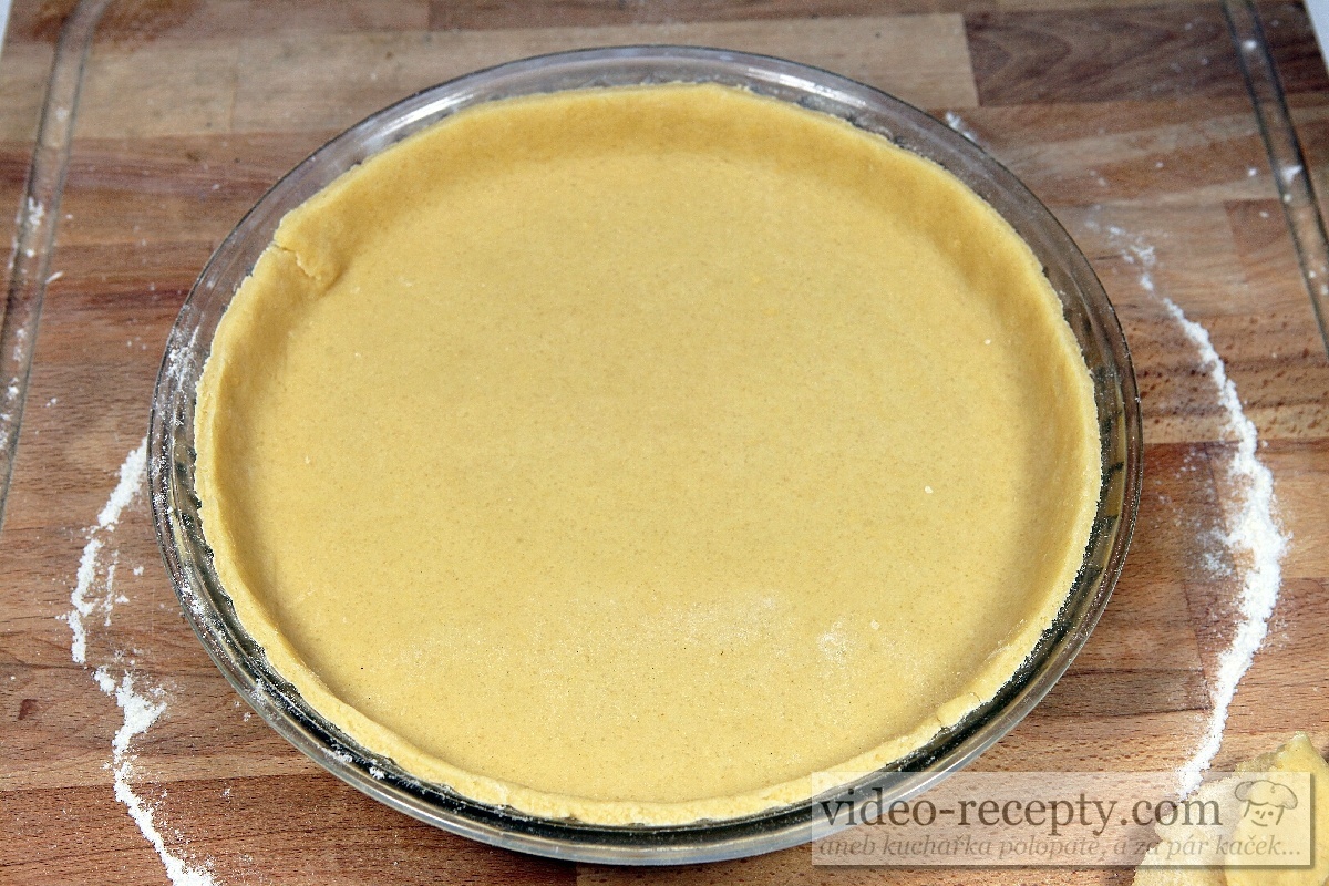 - Cesto natiahneme podľa videa na valček a prenesieme do formy. Usadíme ho tak, aby sa všade dotýkalo stien formy a prebytok orežeme.