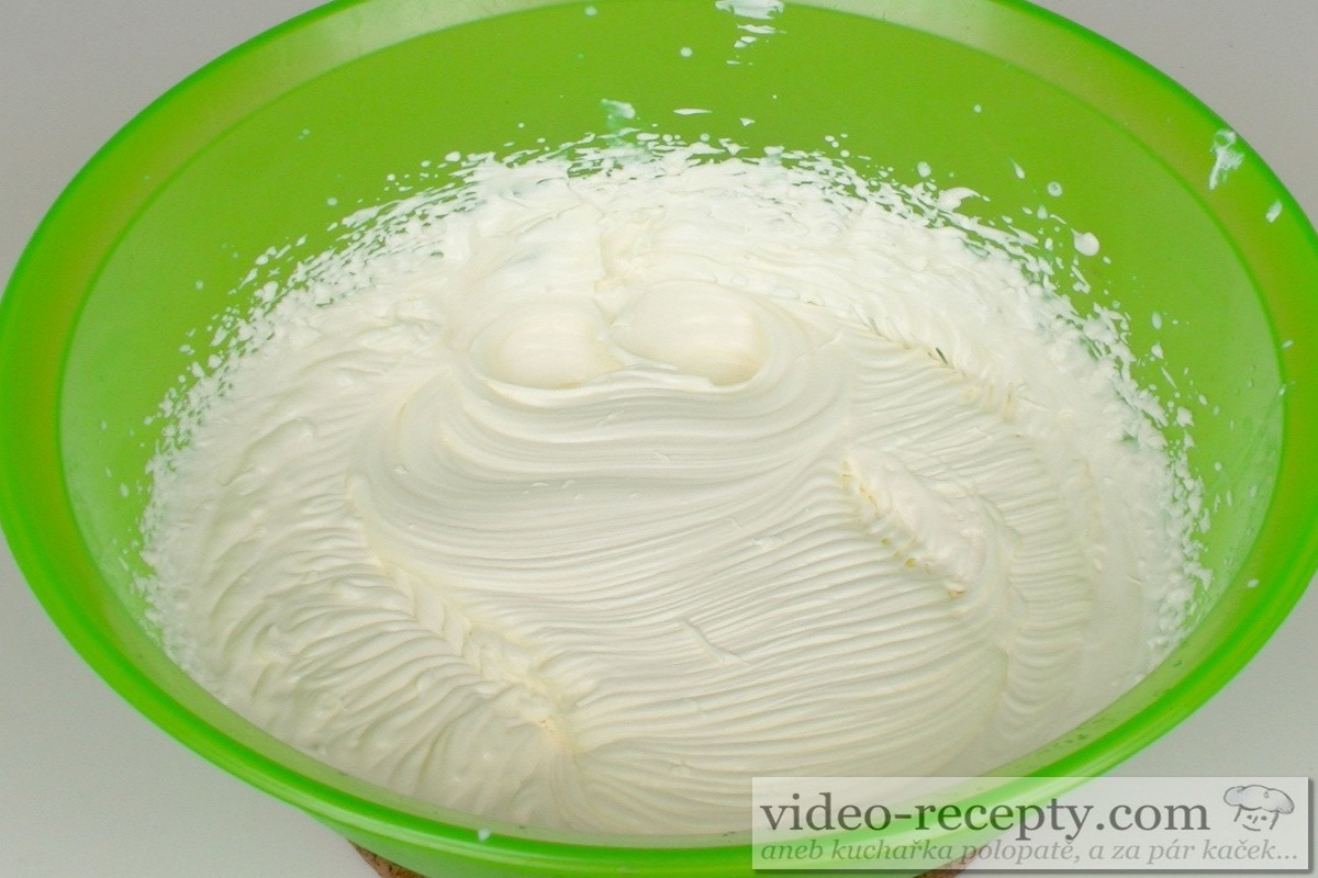 6. Náplň vyrobíme tak, že do misy dáme 1 balenie nátierkového masla, 75 gramov práškového cukru a 250 ml šľahačky. Všetko elektrickým mixérom vyšľaháme do peny. Výsledok je dobre vidieť na videu. Ak by sme chceli krém čokoládový, resp. kakaový, kakao do náplne vmiešame teraz. Tiež môžeme urobiť 1 / 2 náplne kakaové, a polovicu svetlé.