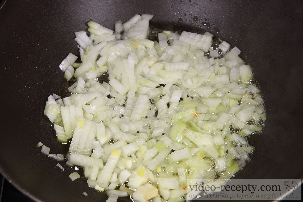 - Na panvicu nalejeme 3 lyžice oleja a na ňom osmažíme dve veľké cibule. Vyprážanie ukončíme, keď cibuľa začína zlatnúť.