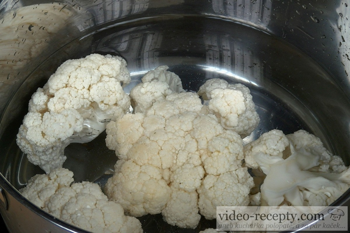 - 500 gramov karfiolu uvaríme do mäkka. To bude trvať niekoľko minút, podľa toho, ako je dužinatá časť široká, preto veľké a dužinaté kusy karfiolu prekrojíme na polovicu. Po uvarení ho necháme vychladnúť a nakrájame na drobnejšie kúsky.